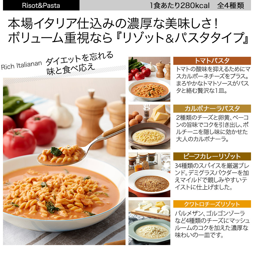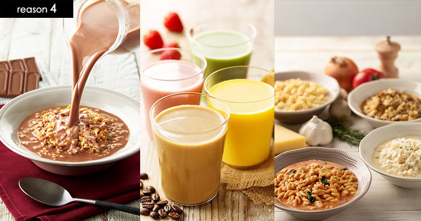 ドリンクタイプの味は全7種、リゾットタイプは全4種、シリアルタイプは全2種。