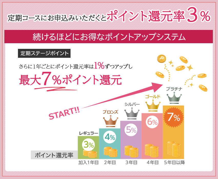 ●現在定期コースを継続中のお客様には、継続期間に応じた会員ステージおよびポイント還元率が適用されます。 ●すべての定期コースを退会されますと、定期会員ステージから外れます。その後に、再び定期コースにご加入いただいた際は、ポイント還元率3%からのスタートとなりますのでご注意ください。